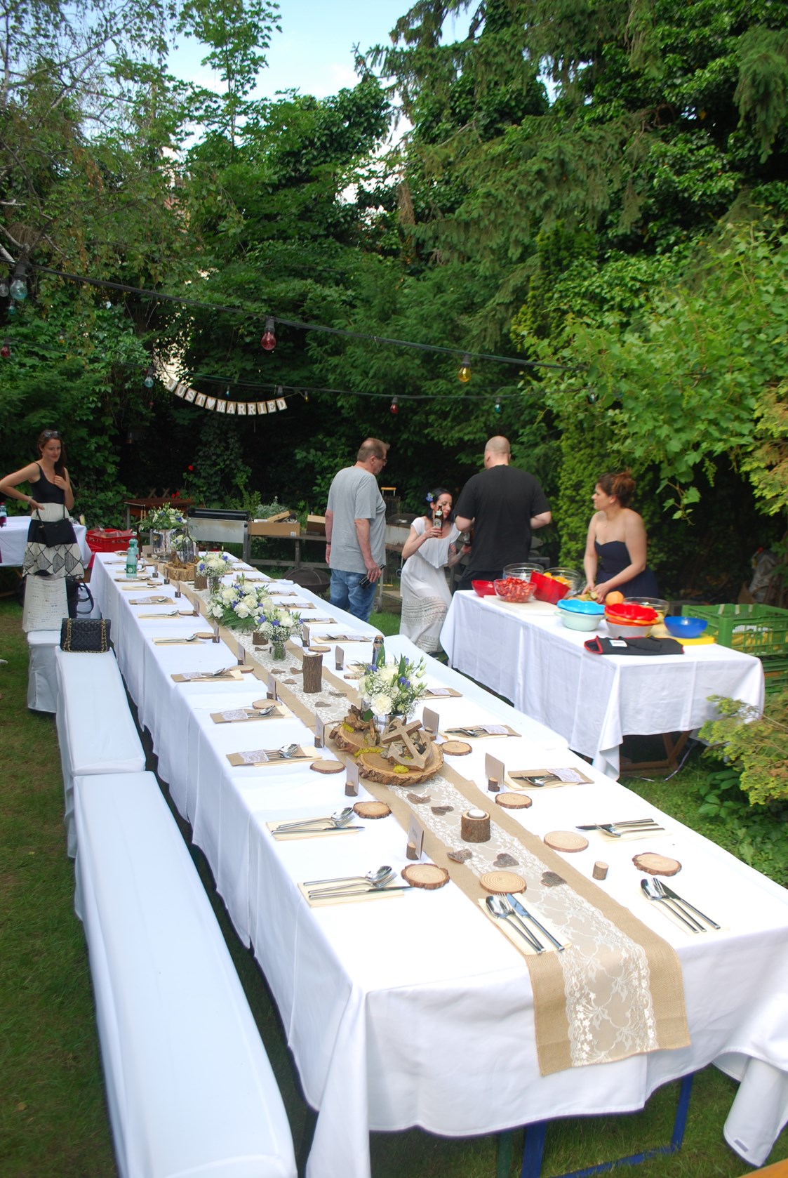 Eine schöne Lokation mit Outdoor. Schließlich entschieden sie sich dazu ihre Feier in eine eine kleine Gartenhochzeit umzuwandeln. Wir bieten Ihnen die komplette Hochzeitsdekoration aber auch die Einladungskarten den Schmuck für das Auto oder den Fotografen.
